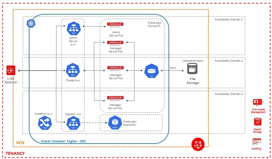 - Load Balancing: By default, the WebLogic servers (admin or clustered managed servers) created by the operator are not exposed outside the Container Engine for Kubernetes cluster, so to expose an application to the outside world, we use the Load Balancing service.