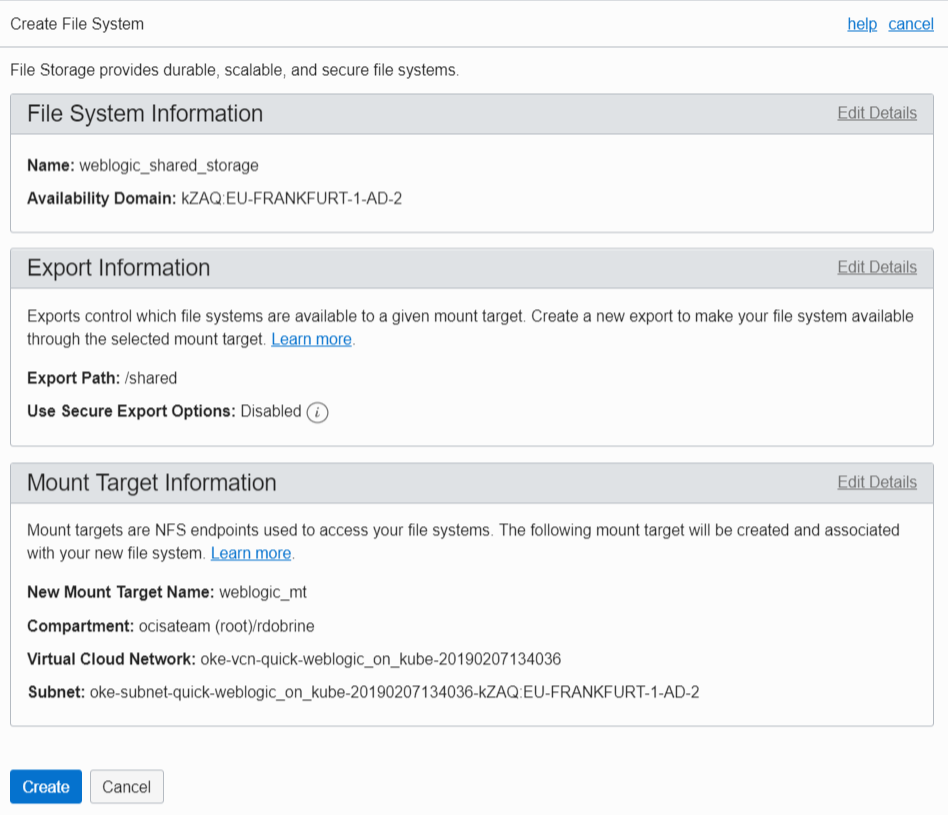 - Click Edit Details and enter the name of the file system, the export path, and the name of the mount target. Select the same VCN as the cluster and one of the subnets where the worker nodes are running. When you do this, you don’t have to set up additional VCN routing and security to have the file system reachable from the worker nodes, although you can do that if you require better isolation.