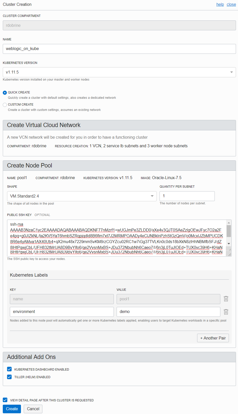 The Oracle Cloud Infrastructure Console also has a Quick Create option that automatically creates a new VCN to support the cluster. To use this option, log in the Console and follow these steps: