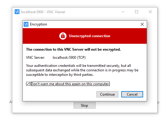 If you get an “Unencrypted connection” security warning, it is safe to click Continue. The SSH tunnel created by the console connection provides an encrypted tunnel to the console so VNC does not have to.