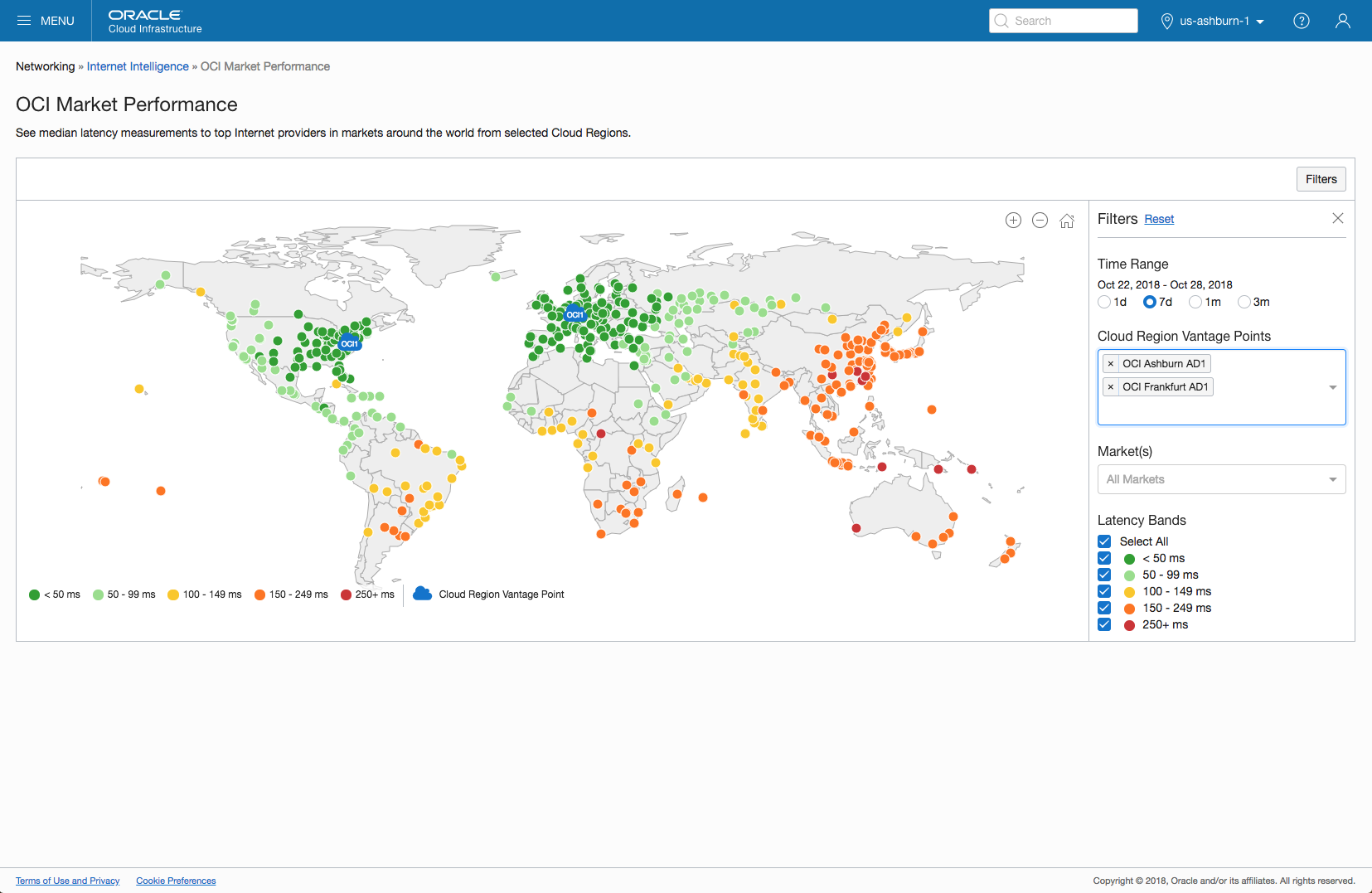 This Oracle Internet Intelligence dashboard shows historical latency to multiple global markets within the Oracle Cloud Infrastructure customer console: