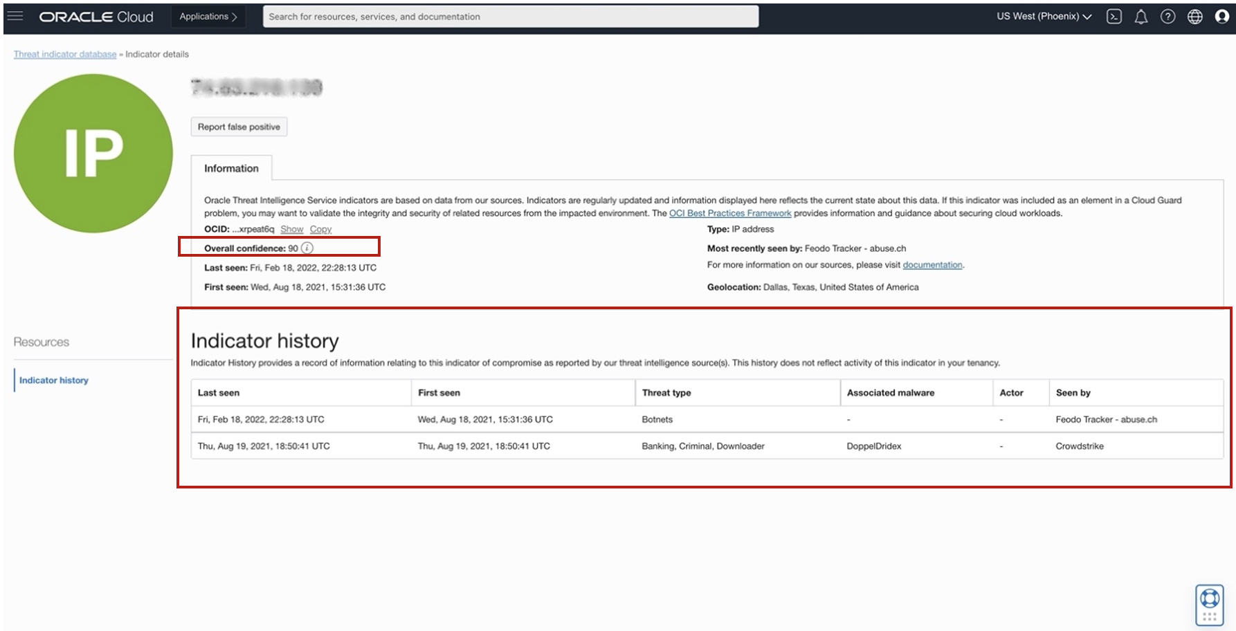Having Oracle manage the ingest and curation of threat intelligence data reduces the burden on your security engineers. Threat Intelligence Service ingests, deconflicts, normalizes, and processes the data, and then assigns an overall confidence score indicating potential maliciousness. Factors that affect overall confidence may include quality of the source, observations of behavior, frequency of sightings, and recency. Though overall confidence is a point-in-time assessment, we also provide the indicator history to give responders contextual insights to accelerate alert triage and remediation (see Fig. 2).