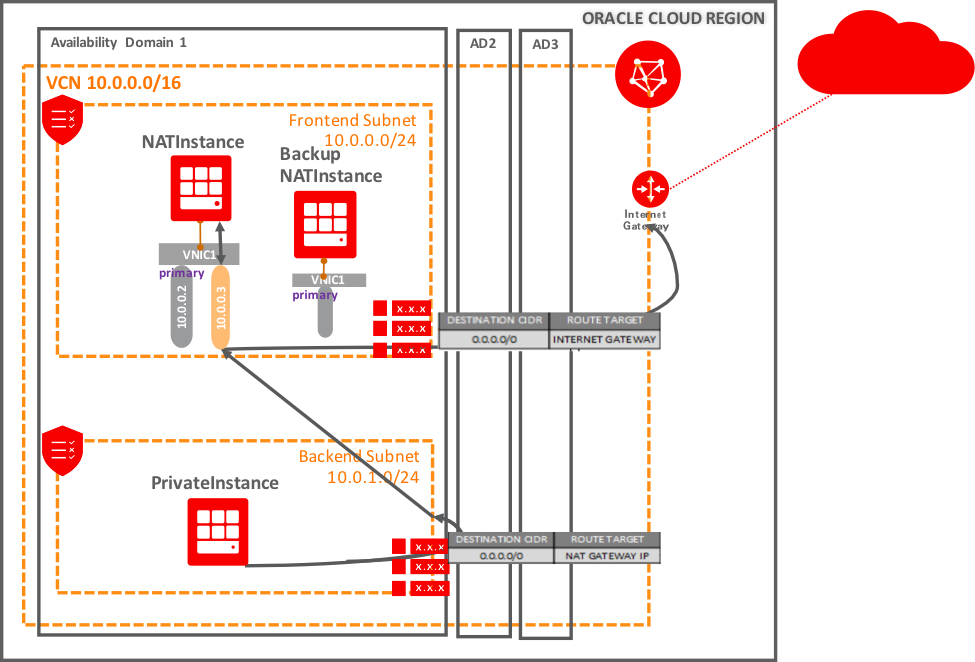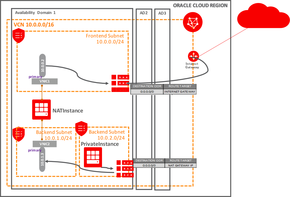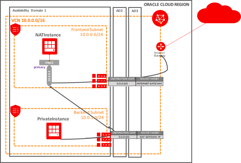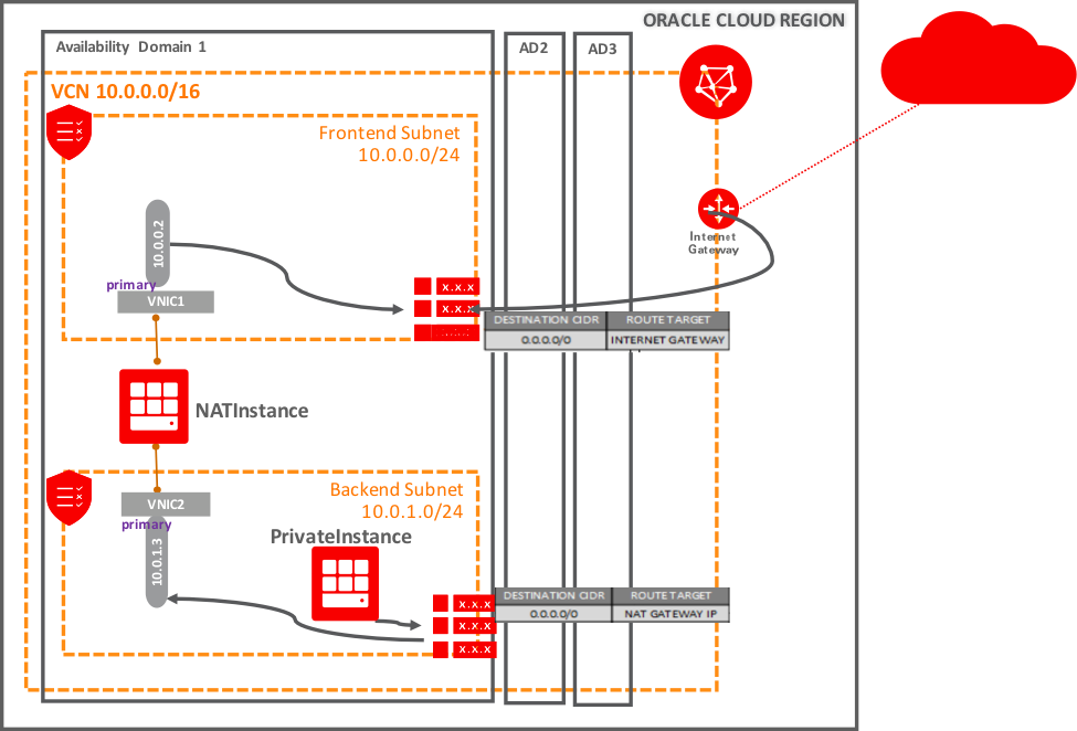 Private subnet’s route table Private Route has a routing rule, where NATInstance second vNIC’s private IP address (10.0.1.3) configured as the route target for all traffic 0.0.0.0/0.