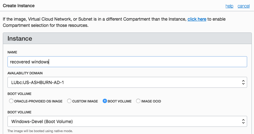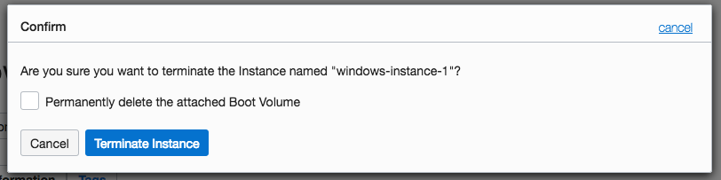 Step 1: Terminate the Windows instance, preserving the boot volumeIn the Oracle Cloud Infrastructure Console, terminate the Windows instance, but clear the Permanently delete the attached Boot Volume check box. Preserving the boot volume enables you to modify it and reuse it to create a new instance, preserving all the data while destroying an actual virtual machine.