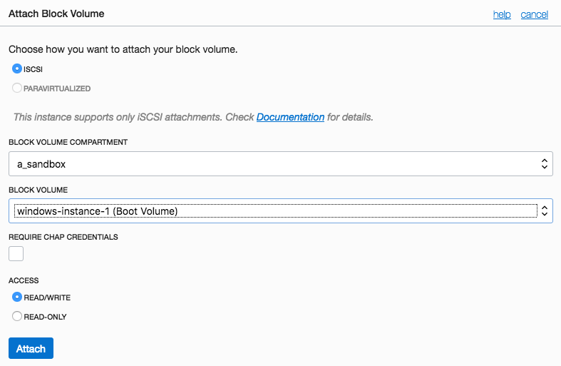 When the Ubuntu instance switches to the RUNNING state, attach the Windows instance boot volume as a block storage volume.