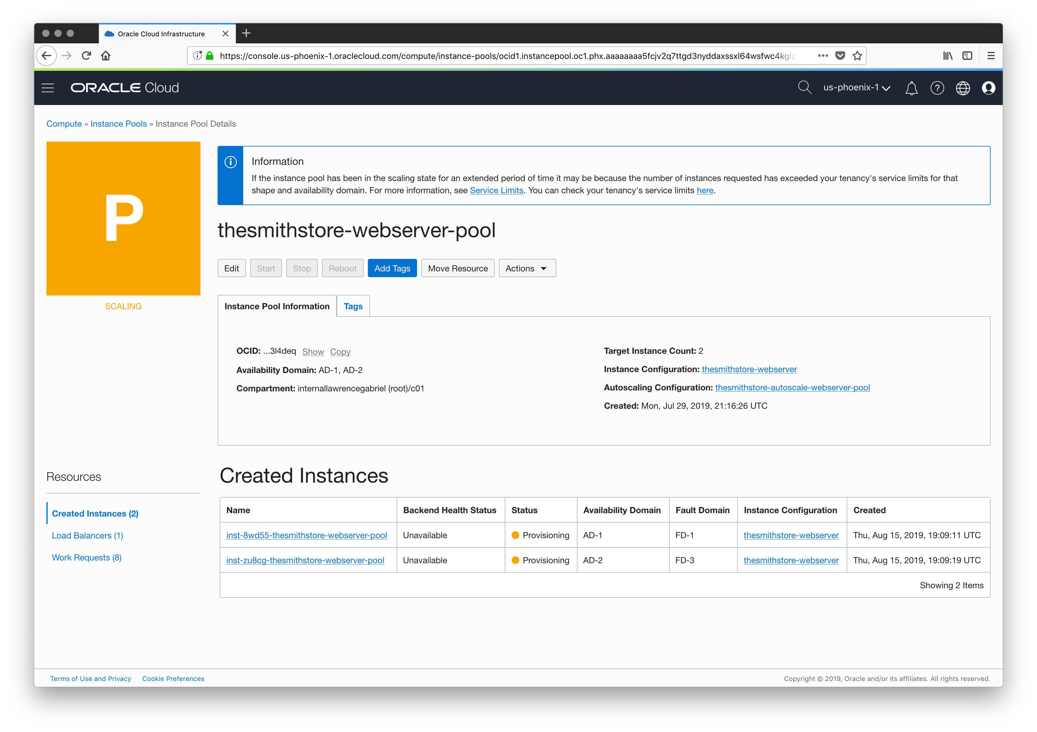 $ oci --profile AUTOSCALE compute-management instance-pool create --from-json file://thesmithstore-instance-pool.json