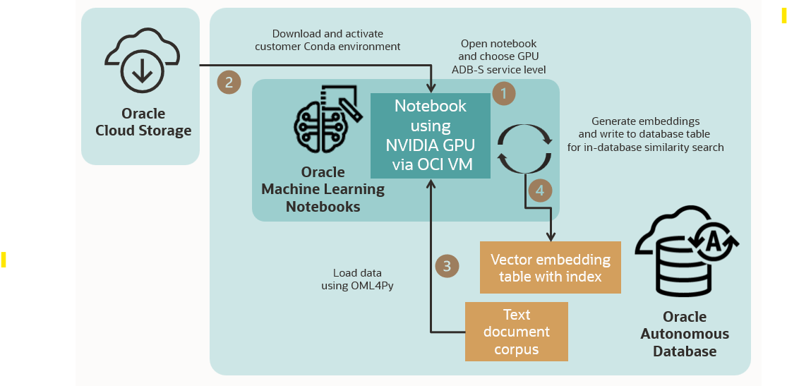 In our first demonstration, which will be generally available at Oracle CloudWorld, we are showing how integrated access to NVIDIA GPUs through Oracle Machine Learning (OML) Notebooks in Oracle Autonomous Database – Serverless can be used to generate vector embeddings. This capability lets users leverage the Python interpreter in OML Notebooks—an integral feature of Autonomous Database—to load data from a database table into the GPU VM supporting the notebook Python interpreter, generate vectors embeddings on the GPU instance, and store those vectors in the Oracle Database where they can be searched using AI Vector Search. Provisioning of the GPU instance is done automatically for users, and data is transferred between the database and the GPU-accelerated VM using functions from Oracle Machine Learning for Python.