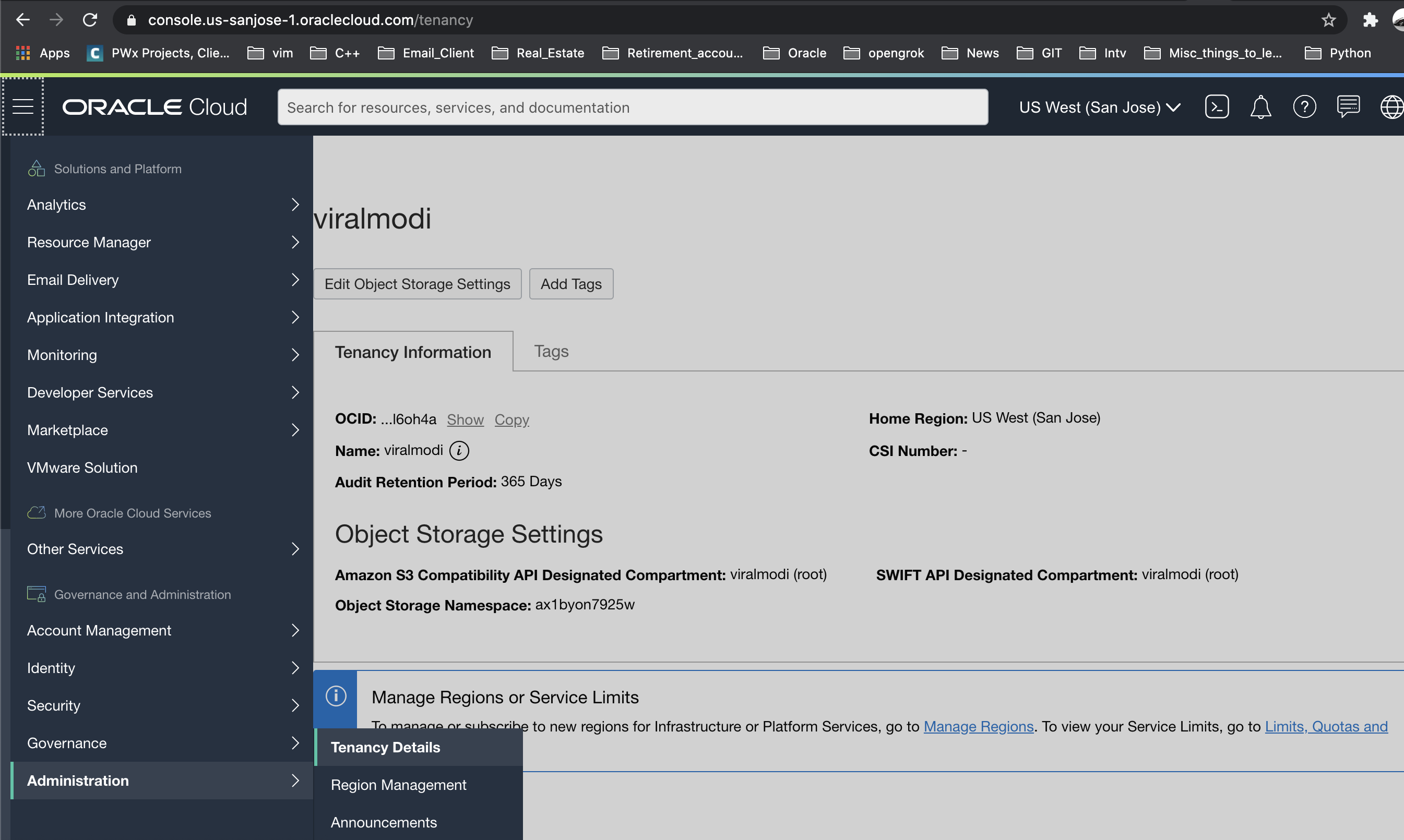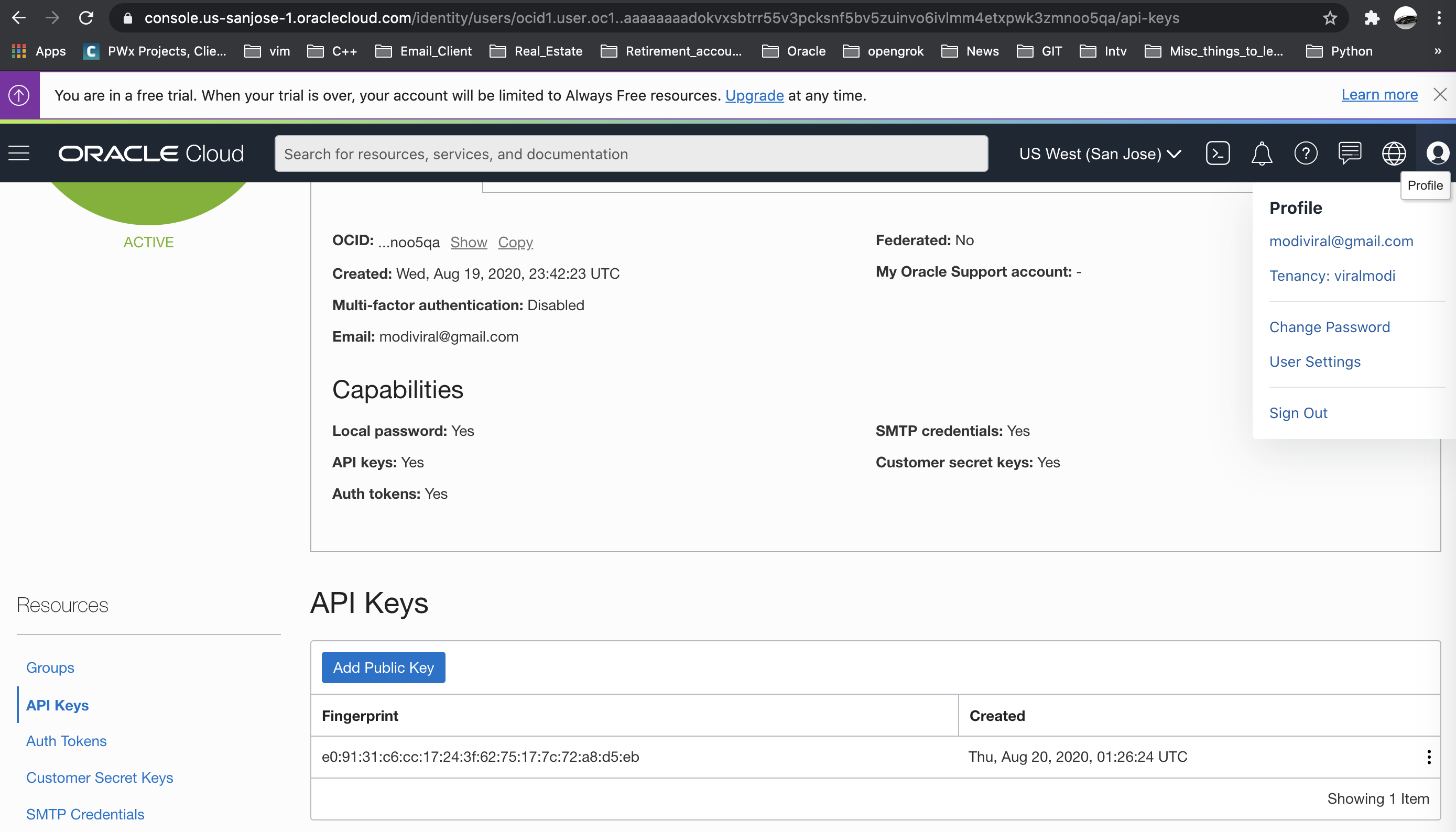 user=ocid1.user.oc1.. key_file=/Users/viralmodi/.oci/my_oci_api_key.pem fingerprint=f7:12:34:56:78:90:ab:bc:cd:de:ef:98:87:65:43:21 tenancy=ocid1.tenancy.oc1.. region=us-sanjose-1