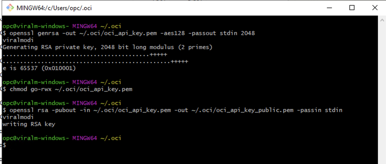 mkdir ~/.oci openssl genrsa -out ~/.oci/oci_api_key.pem -aes128 -passout stdin 2048 --> Enter the passphrase when prompted. It will create RSA private key encrypted with passphrase. chmod go-rwx ~/.oci/oci_api_key.pem --> Remove rwx permissions for group and others. openssl rsa -pubout -in ~/.oci/oci_api_key.pem -out ~/.oci/oci_api_key_public.pem -passin stdin --> Generate public key.