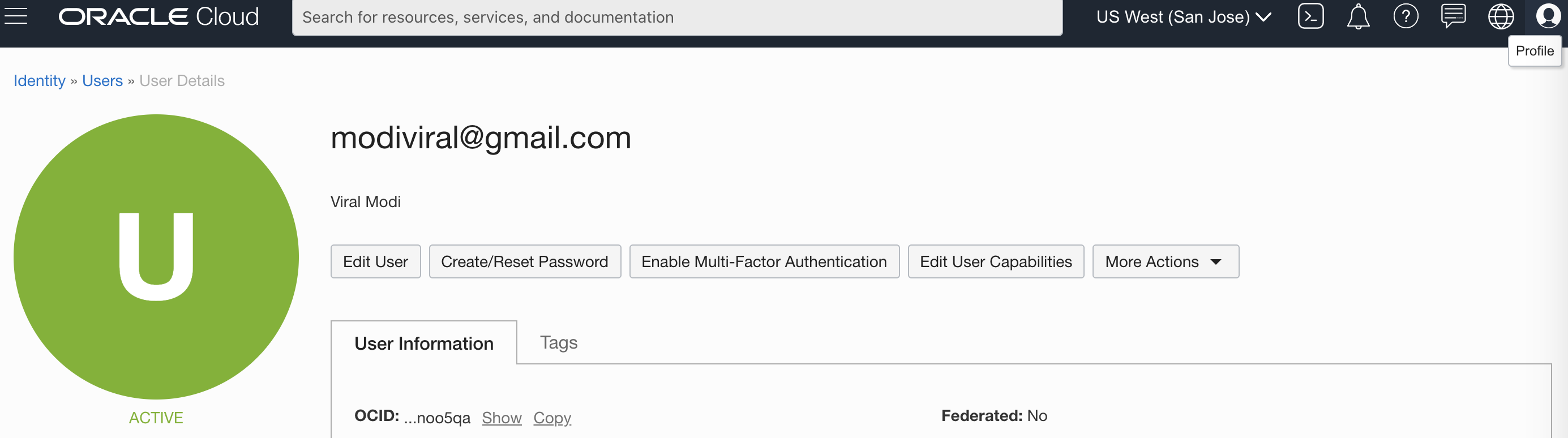 The user Oracle Cloud ID (OCID) is shown under User Information. OCIDs are Oracle Cloud Resource Identifiers. They’re unique to every resource.