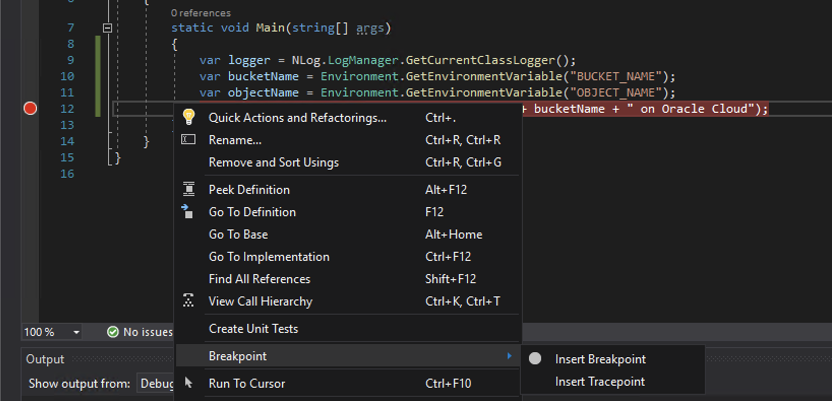 A fully fledged IDE like Visual Studio, used along with Oracle Cloud SDK for .NET, can greatly enhance your productivity when working on Oracle Cloud. I encourage you to try Oracle Cloud Infrastructure SDK for .NET with Visual Studio on Windows or Mac platforms. If you have another favorite IDE, you can easily follow these instructions to do the same on that IDE. If you want us to cover another Oracle Cloud developer tool (with another IDE) in our blog, let me know in comments.