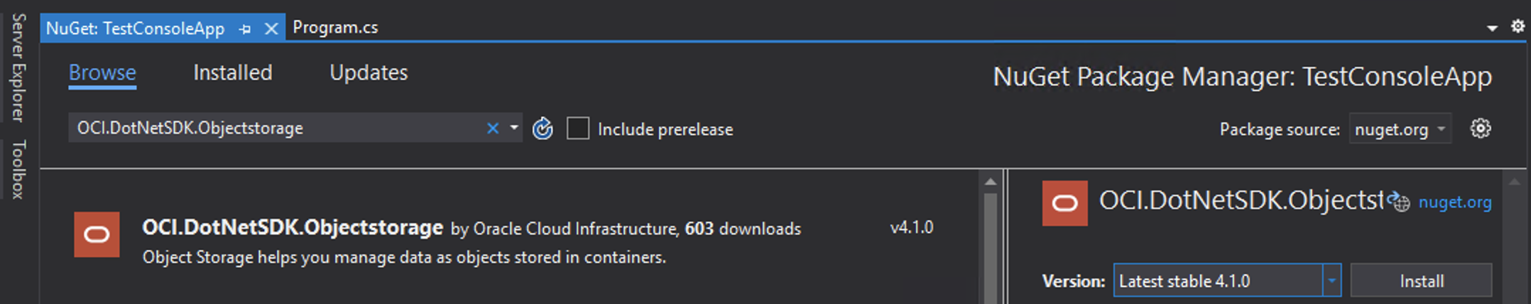My .NET application pushes an object to Oracle Cloud Object Storage Service. So let’s install “OCI.DotNetSDK.Objectstorage” package. Search for this string and click the package. On the right side on the window, details for this package appear, including drop-down of versions and the Install button. Click Install to install the latest version of the package. Installing it also installs all its dependencies. Installed packages for your application show up in the Installed tab on this window. Verify that the ObjectStorage package is installed there.
