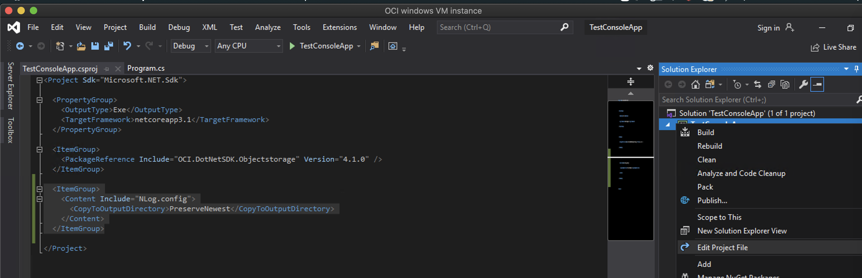 Now, we need to update our projects .csproj file to point to this file. In the Solution Explorer, right-click TestConsoleApp, and click Edit Project File.