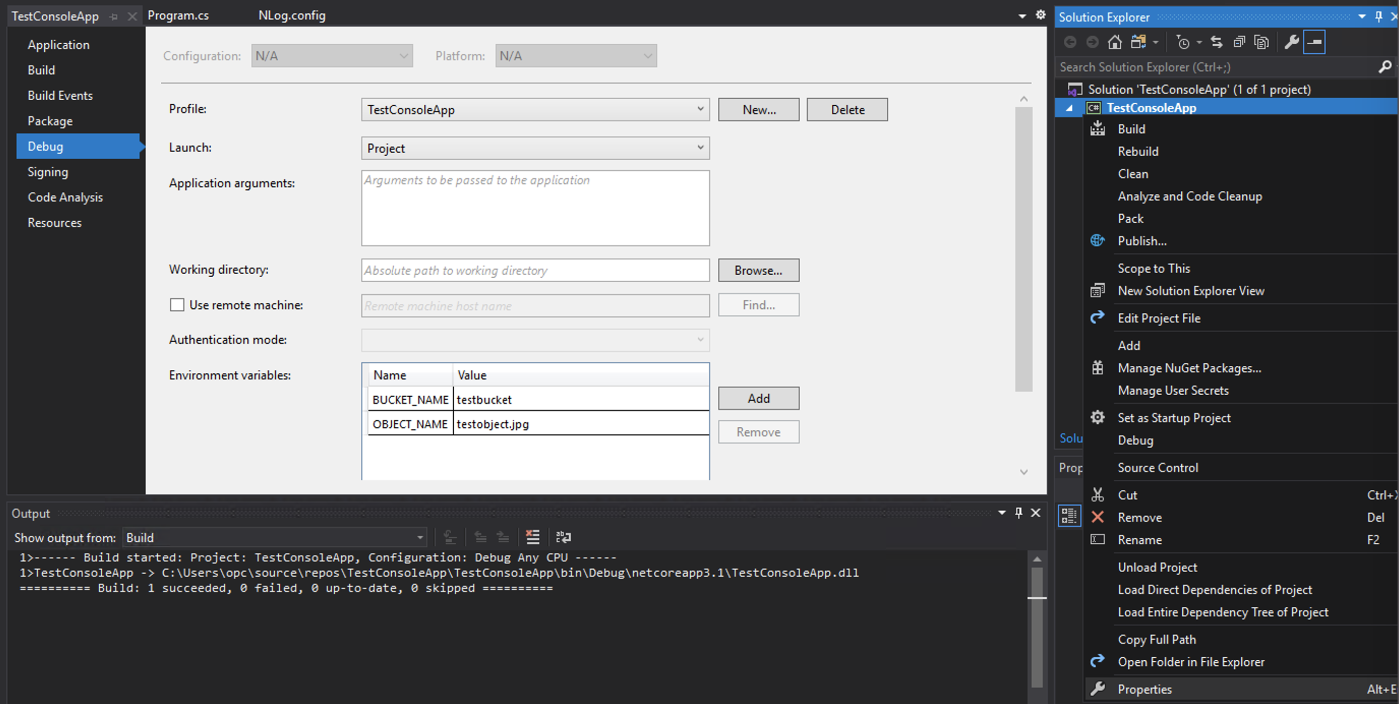 For storing environment variables within Visual Studio IDE, right-click the TestConsoleApp project name on the right in Solution Explorer, and click Properties.