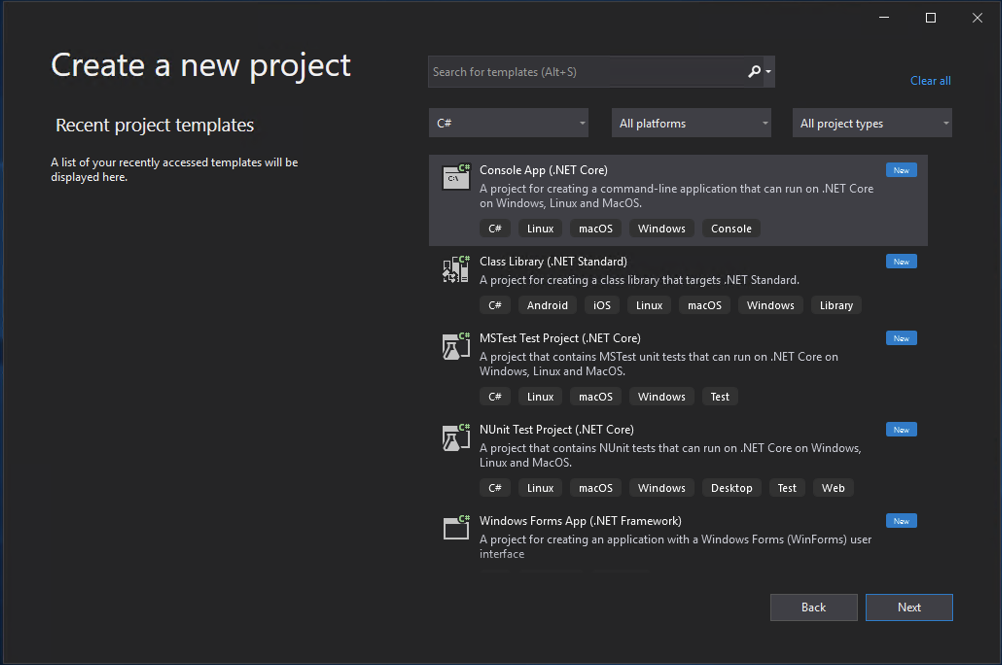 Visual Studio gives the option to pick from existing project templates. In the first column, filter by languages and choose C#.