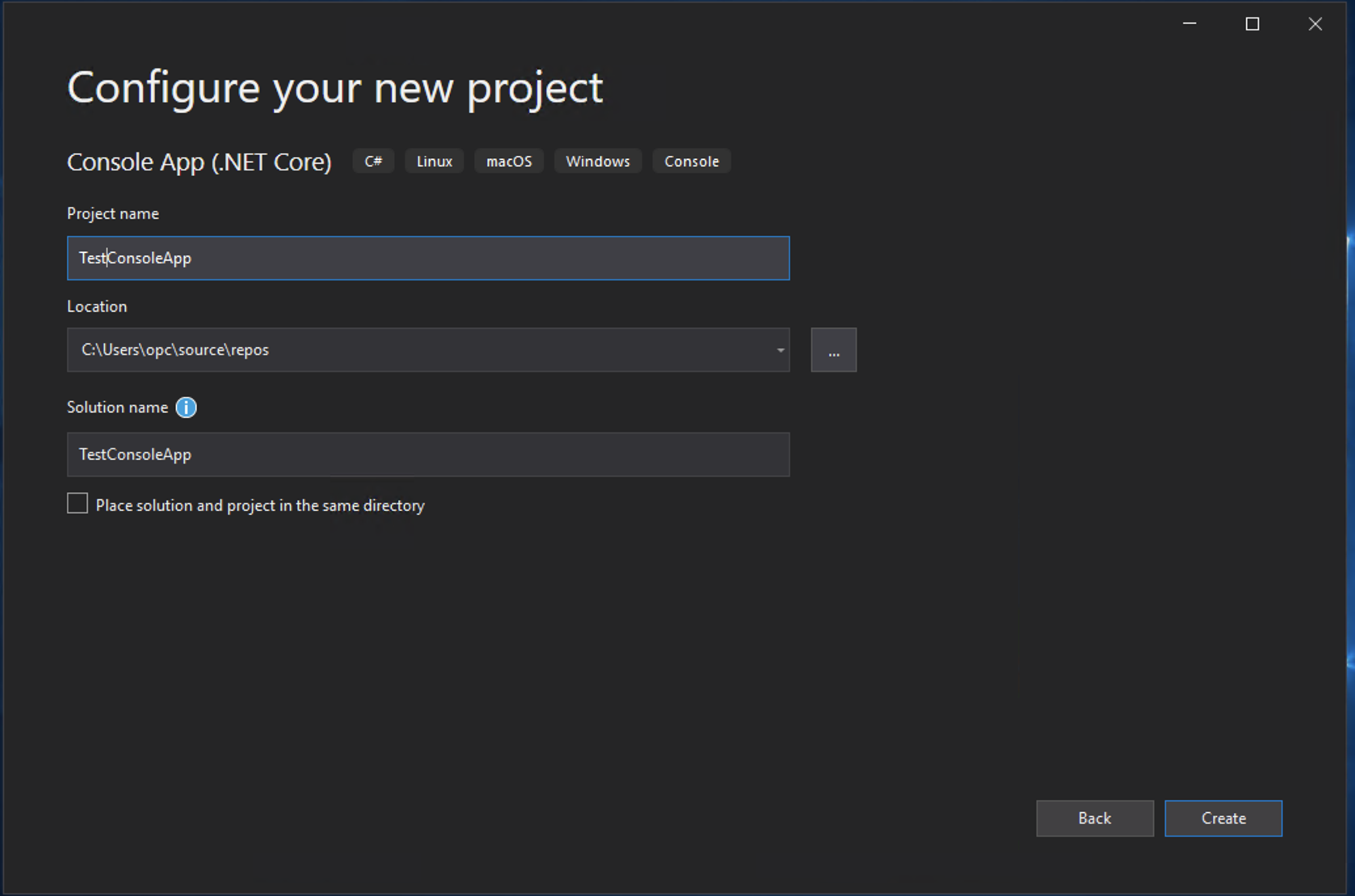 In the next window, name the project “TestConsoleApp” and click Create. Two important files are created: TestConsoleApp.sln and TestConsoleApp.csproj. If there are multiple projects in single solution, the sln file contains information about all your projects. The csproj file has properties and information on each project that make up the sln. In this case, we have one csproj in our sln file.