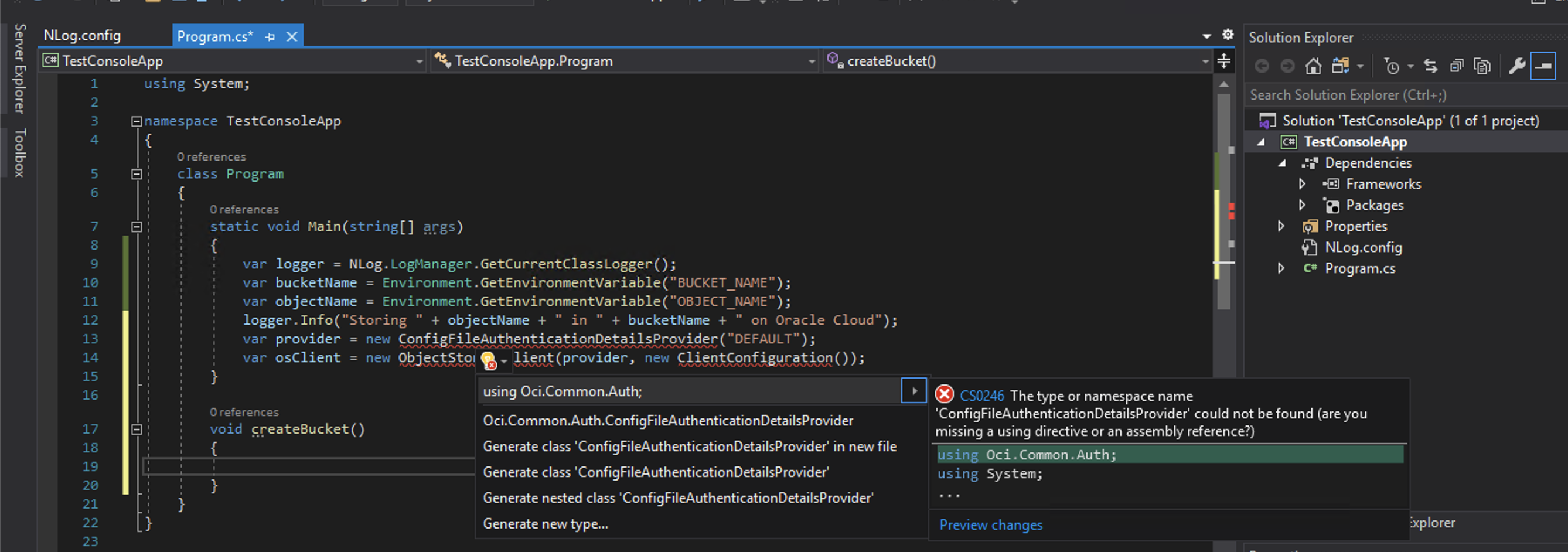 Use Intellisense in Visual Studio whenever possible. When using an Oracle Cloud .NET package API call, if you see a call underlined in red, press Alt+Enter or right-click for IDE suggestions on a fix. IDE automatically adds the “using” statement for the classes you’re using when you do this.