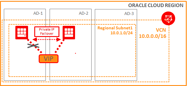 In addition to load balancing, many other applications and clustering solutions use the concept of a virtual “floating” IP address failover. In these scenarios, a cluster of machines is typically connected via a heartbeat, and a failover mechanism causes the IP to move back and forth because of changes in the “active” node that clients use. Before regional subnets, during a failover operation you could move the virtual IP address to an instance only in the same subnet. Now you can move that private IP address to an instance in any of the availability domains.
