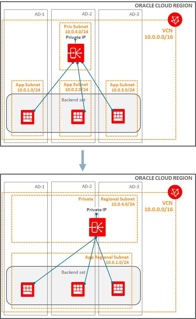 Note: Public load balancers continue to be highly available in availability-domain-specific subnets under a different failover model. Those created on regional public subnets are now redundant in the same manner as described here.