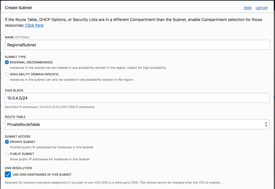 The following screenshot shows that the default (recommended) option for subnet creation in the Oracle Cloud Infrastructure Console is now Regional. When you select this option, you don’t select an availability domain for the subnet. These are the only differences between creating a regional subnet and an availability-domain-specific subnet.