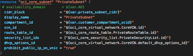 When you deploy a regional subnet from Terraform, you no longer add the availability_domain attribute, as you would with an availability-domain-specific subnet. This is shown in the following screenshot: