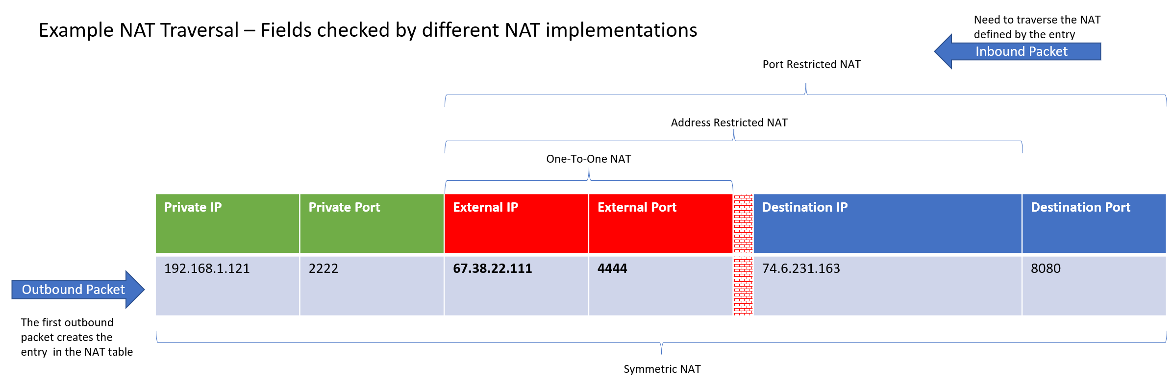 Because of the stringent requirements of the symmetric NAT, peer-to-peer connection between two peer devices isn’t feasible. The connection in this case needs to be relayed through a proxy, where each peer connects to an intermediary, called a TURN server, which handles the marshaling of traffic between the two peers. The other NAT translation methods support direct peer-to-peer connection and don’t need an intermediary.