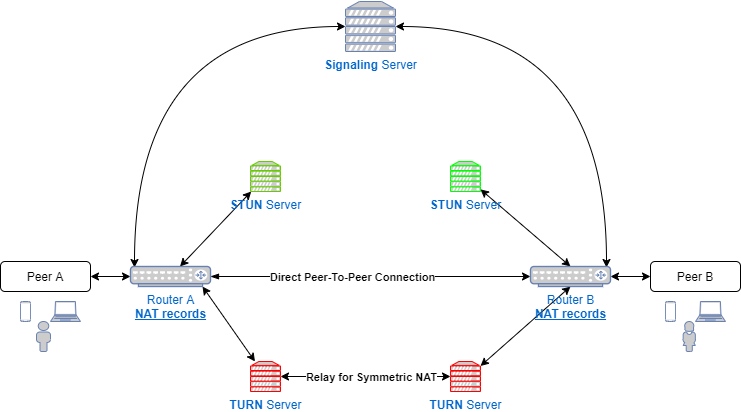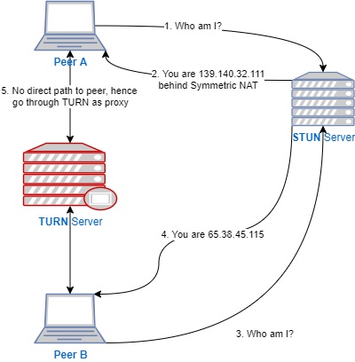 For more secure implementations of NAT, typically in enterprises, firewalls implement symmetric NAT that doesn’t allow direct connection through STUN-based traffic. In these cases, you need a server enabling traversal using relays around NAT (TURN) to act as a proxy relay between the two peers.