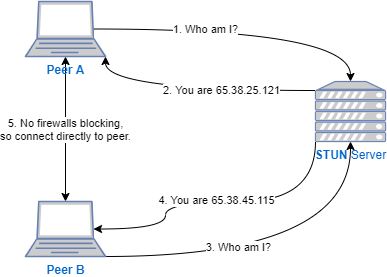 The first step to finding a clear route is for each peer to find its own IP address, aided by a STUN protocol enabled server. After receiving a STUN request, the STUN server responds with a public facing IP address of the requestor. If the requestor is sitting behind a router and has a private IP, the router creates a NAT record and translates the private IP to a public IP, which is visible to the STUN server, and it returns the address it sees, as a response to the STUN request.