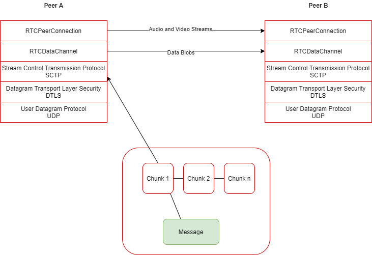 After the direct peer-to-peer connection is established, the peers can exchange AV data streams quickly, providing a near-real-time communication between them. The reliability of AV transmission isn’t paramount because the consumers of the data are typically humans, and missing a few frames of AV isn’t noticed or perceived by humans. So, the underlying protocol used by WebRTC is user datagram protocol (UDP), which provides low-latency and loss-tolerating connection, allowing near-real-time communication. WebRTC uses datagram transport layer security (DTLS) on top of UDP to prevent eavesdropping, tampering, and message forgery of UDP data.