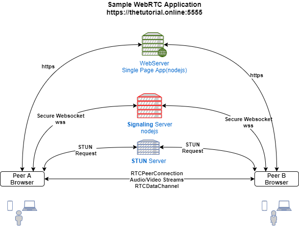 All the components were coded in nodejs, and the peers use WebSockets to connect to the signaling server. The application is served through an HTTPS-enabled webserver to allow access to the web cameras and microphones of the peer devices for AV streams. Although several sophisticated Javascript wrapper libraries are available that hide the complexities of RTCPeerConnection,  signaling process and reduce the client code footprint to a few lines of code, this example used raw API to clearly understand all the underlying interactions for a successful peer-to-peer connection.
