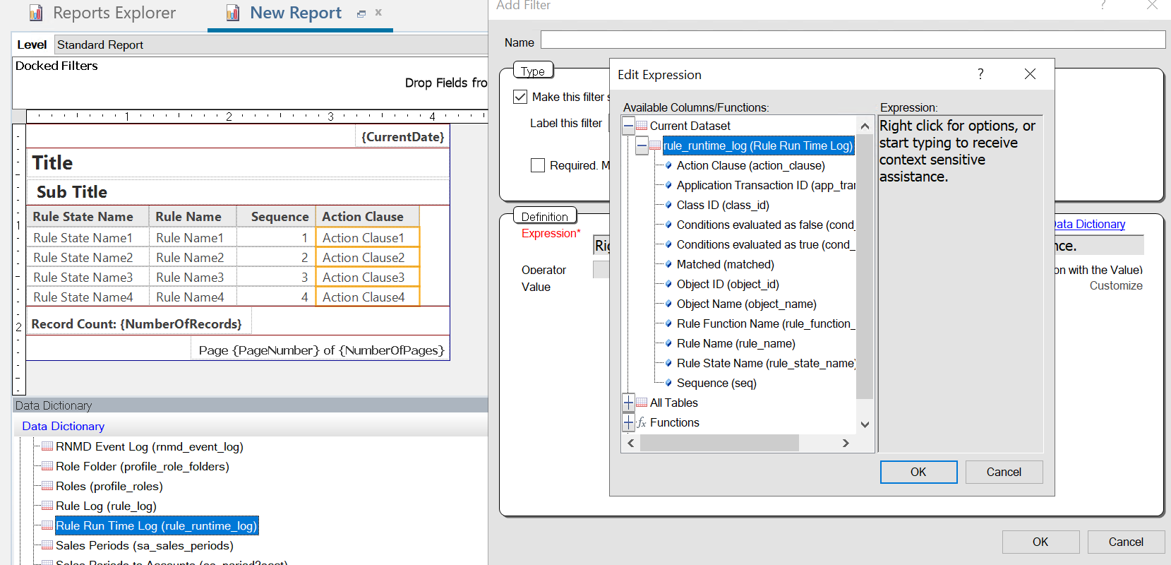 With enhanced capabilities of EBR, it is important to have the ability to view rule execution details as a report. The canned report named “Rule Runtime Log”(report id : 13158) can be utilized to view rule execution information. However, the need to customize a rule report would help in troubleshooting and understanding the pattern of rule execution. Having the ability to edit fields, new filter or slice etc. will help to analyze rule execution in a better and easy way. To achieve customizations on browser UI based enhanced business rule execution, the rule runtime log table is added to the report designer from 24A.