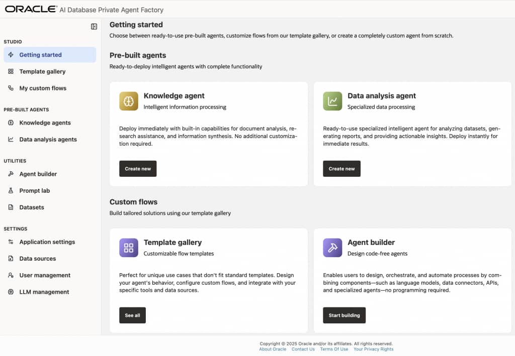 The Private Agent Factory is available with the Oracle AI Database, and you can experience it with a hands-on-lab here. The front screen shows the pre-built agents, custom templates available, and an agent builder flow that lets you build any agent in a canvas.