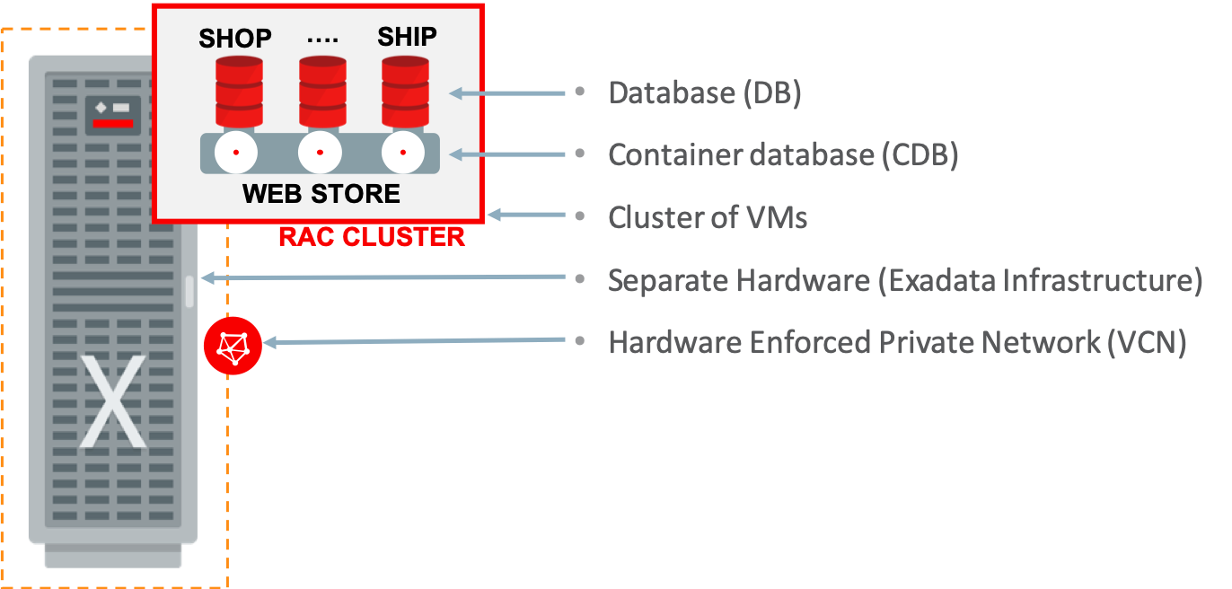 Within each of your dedicated Exadata racks you can create further levels of isolation by creating separate clusters, and / or Container Databases (CDB). You can also isolate different workload by creating multiple Databases within each CBD.