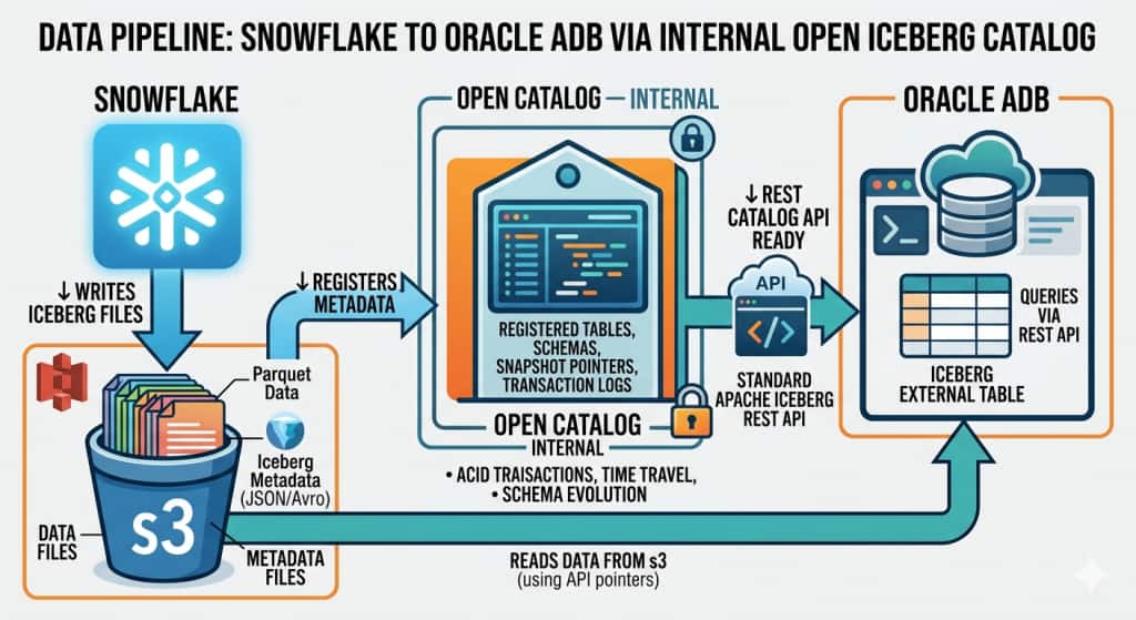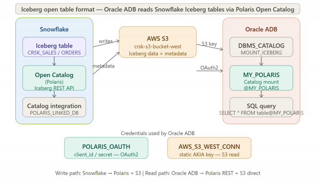 In this article, we demonstrate a complete end-to-end solution to query Apache Iceberg tables created in Snowflake and stored in Amazon S3, read directly from Oracle Autonomous AI Database (ADB) using the Polaris Open Catalog and Oracle’s DBMS_CATALOG package — with zero data movement, no ETL, no replication and enables seamless cross-platform analytics using open standards.