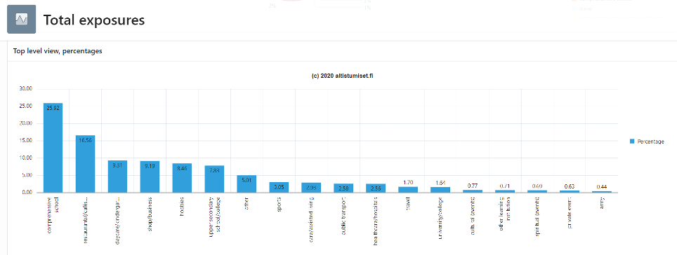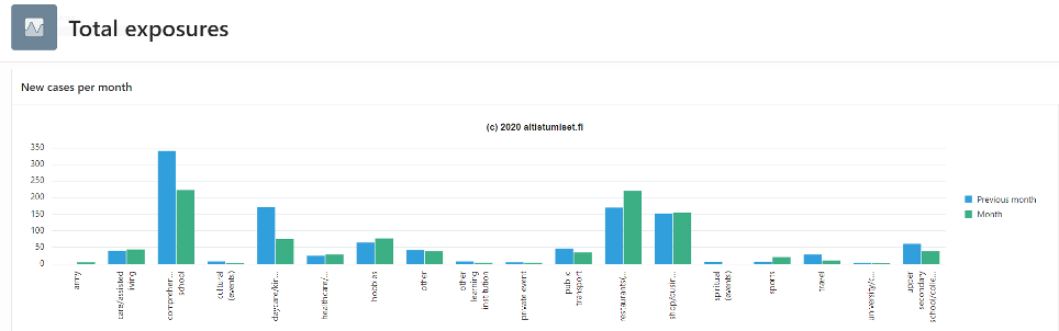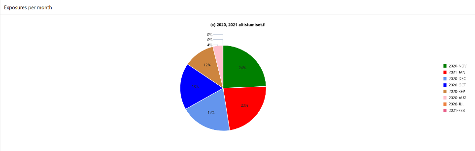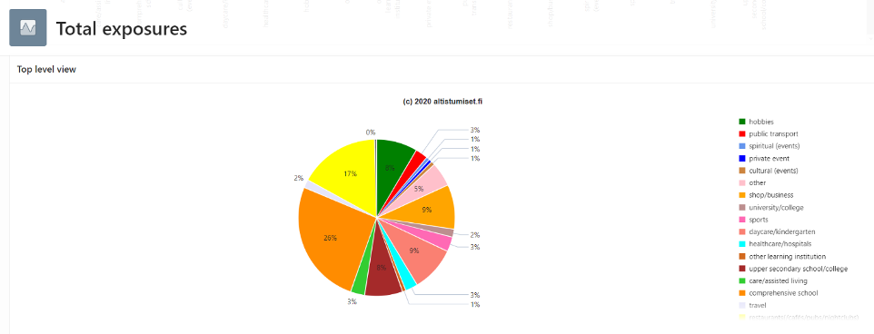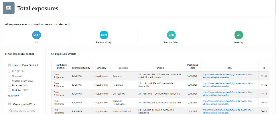 Total exposures (Figure 10) shows all exposures in Finland since the group started to register them. Users can filter the exposure events by a healthcare district, municipality/city, or other category.