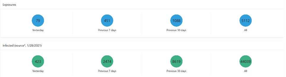 The most recent addition to the application is Current situation, which shows how Finland is doing with COVID-19 today. This data shows in a heat map view where the most exposures have happened over the past 21 days and displays the number of exposure events and infected people for yesterday, past 7 days, past 30 days, and in total (see Figure 15). The source for the number of infected is the COVID-19 data repository maintained by the Center for Systems Science and Engineering (CSSE) at Johns Hopkins University.