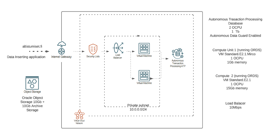 On the busiest day recorded, the application had 600,000 distinct users, and the peak period had 300,000 users in a two-hour period, which the application was able to handle quickly. What did cause the team some headache was the disk space. The application stores quite a lot of images for analyses and correctness of the data within the database itself, which requires additional storage. Oracle’s Always Free cloud service has a storage limitation, and the application came very close to hitting that limit. We had started thinking about a possible solution when Oracle offered instead to sponsor the application with a cloud service that provided sufficient resource limits. Figure 15 shows the new architecture.