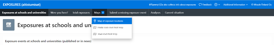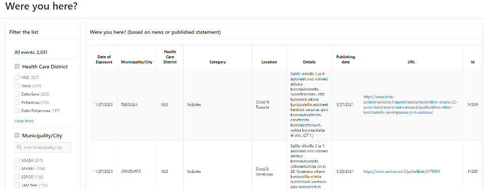 The most useful functionality to the general public has been “Were you here?” This ability enables someone to check whether they have been in a public place that’s experiencing exposures. On this page, users can see where and when an exposure has happened. They can also filter the exposure events by a healthcare district, municipality/city, or categories such as restaurant, shop, hobby, public transport, spiritual event, private event, or daycare/kindergarten.