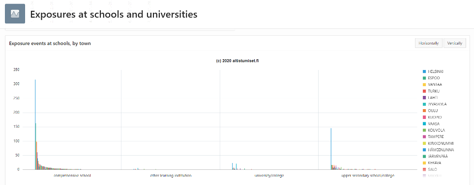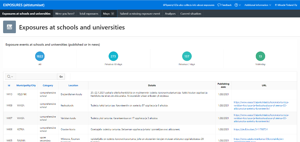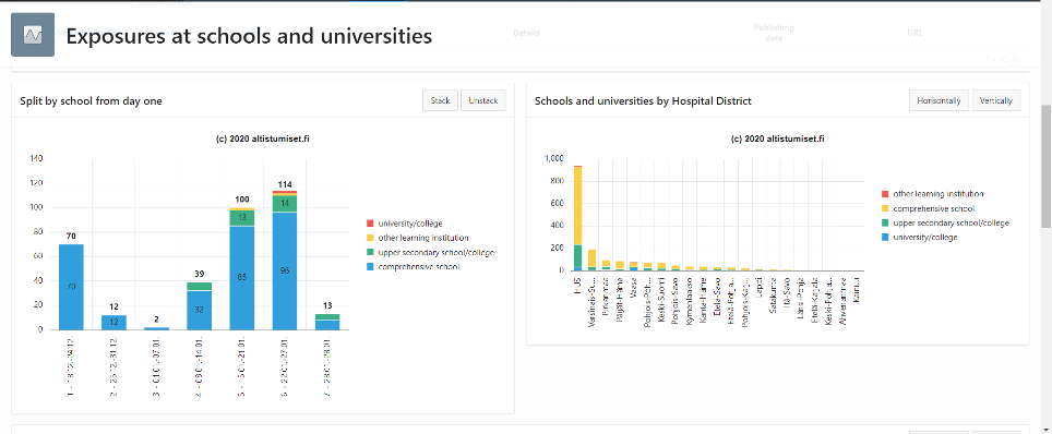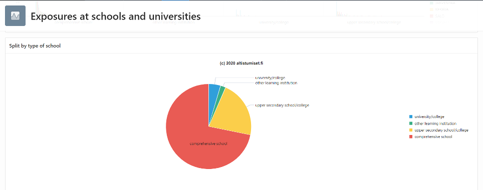 Users have the ability to view some of the data as spreadsheets, with the option of sorting the data or selecting just some of the data based on different criteria. However, the easiest way for the human eye to see the data is via charts and graphs. It is quite easy to show the data in a visual way by using Oracle APEX, and altistumiset.fi uses many of those features. Exposures in schools and universities shows the number of exposures in total (since data collection started) as well as exposures during the previous 30 days, previous 7 days, or previous 1 day (see Figure 5).