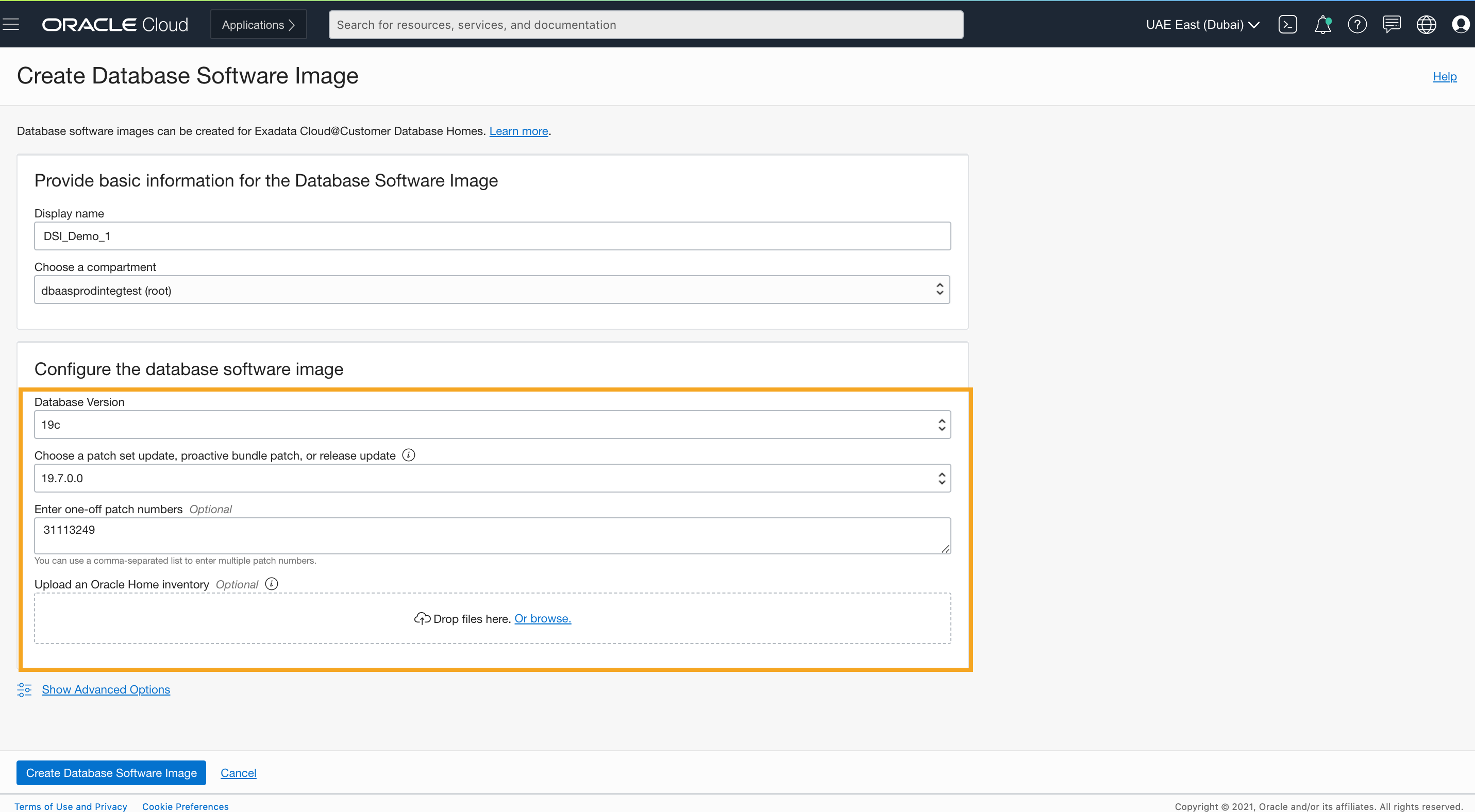 Custom Database Software Images are managed as an OCI resource and automatically saved to a service-managed object store bucket. To build a custom image, you can specify a major database version (such as 19c) with specific Release Update (RU) and optionally specify one-off patch IDs as a comma-separated list and/or upload an existing Oracle Database Home inventory file (opatch lsinventory output). You can fully manage the life cycle of these custom Database Software Images, which are compartment aware and belong to a specific region in which they are created.