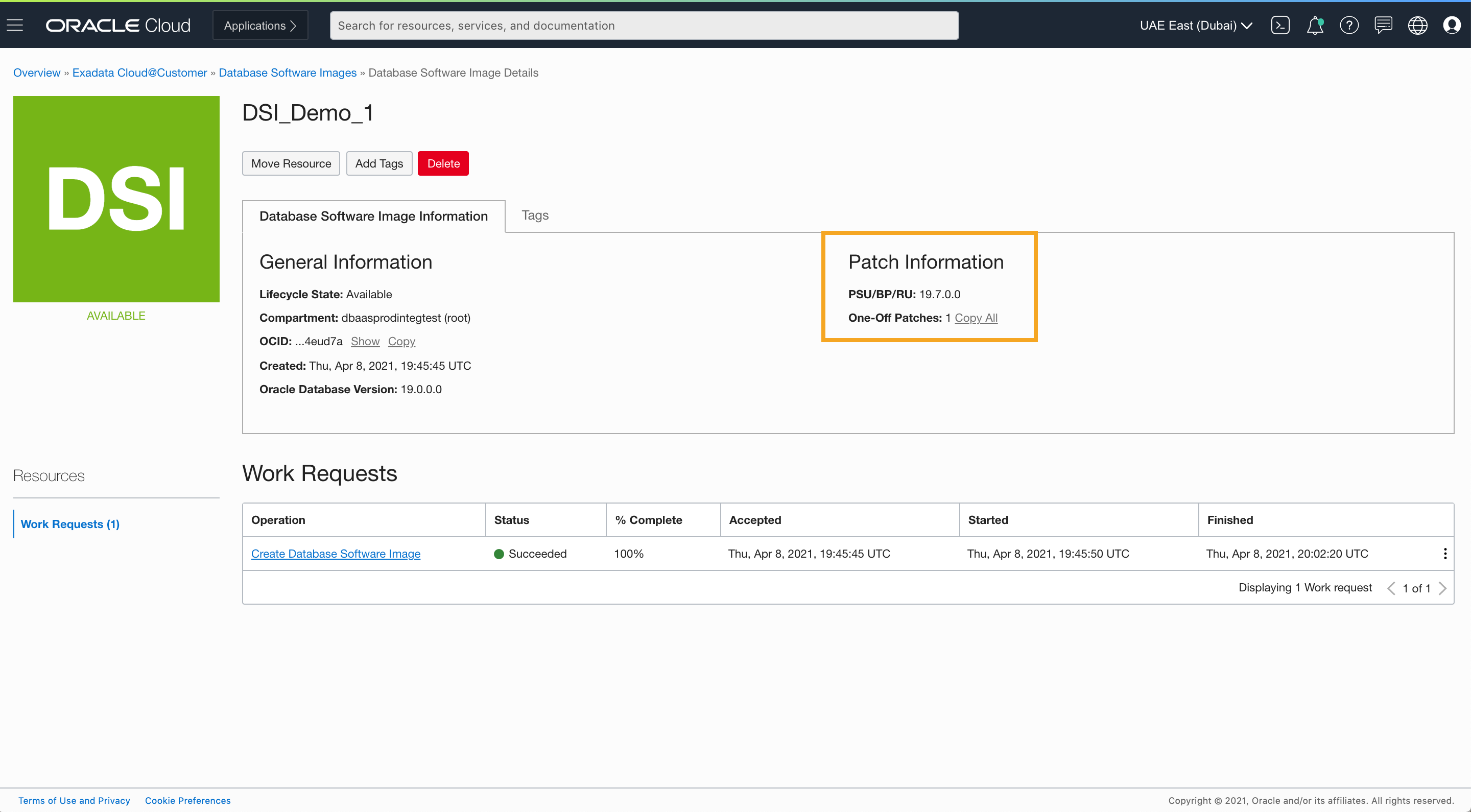 The custom Database Software Image is created with the selected database version and specified one-off patches.