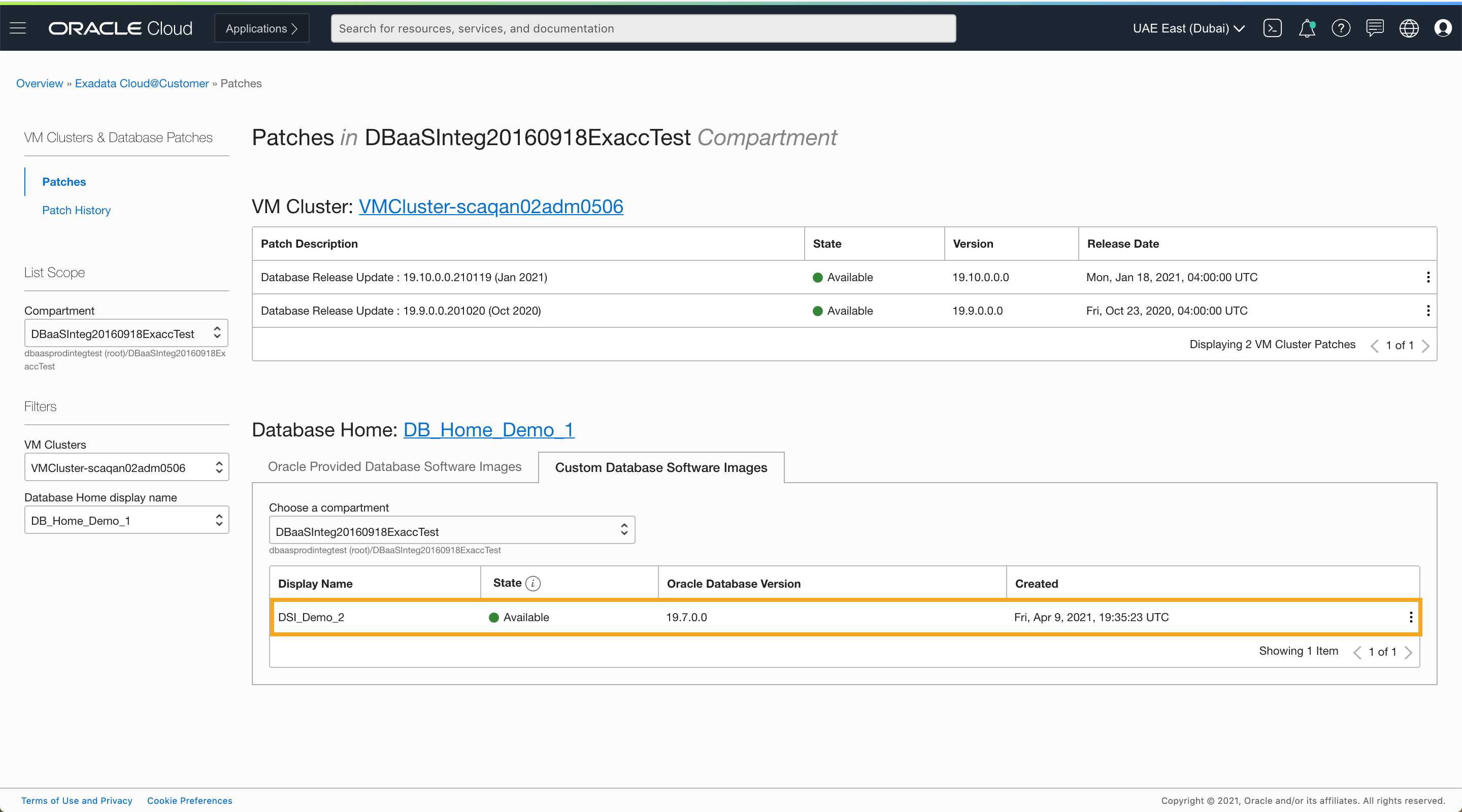 You are presented with custom Database Software Images that are built using the latest four RU versions as patching options for the Database Home. In addition, custom Database Software Images with the same version but different one-off patch IDs are also available to apply as a patch. The custom Database Software Image selection list available for patching is filtered by compartment.