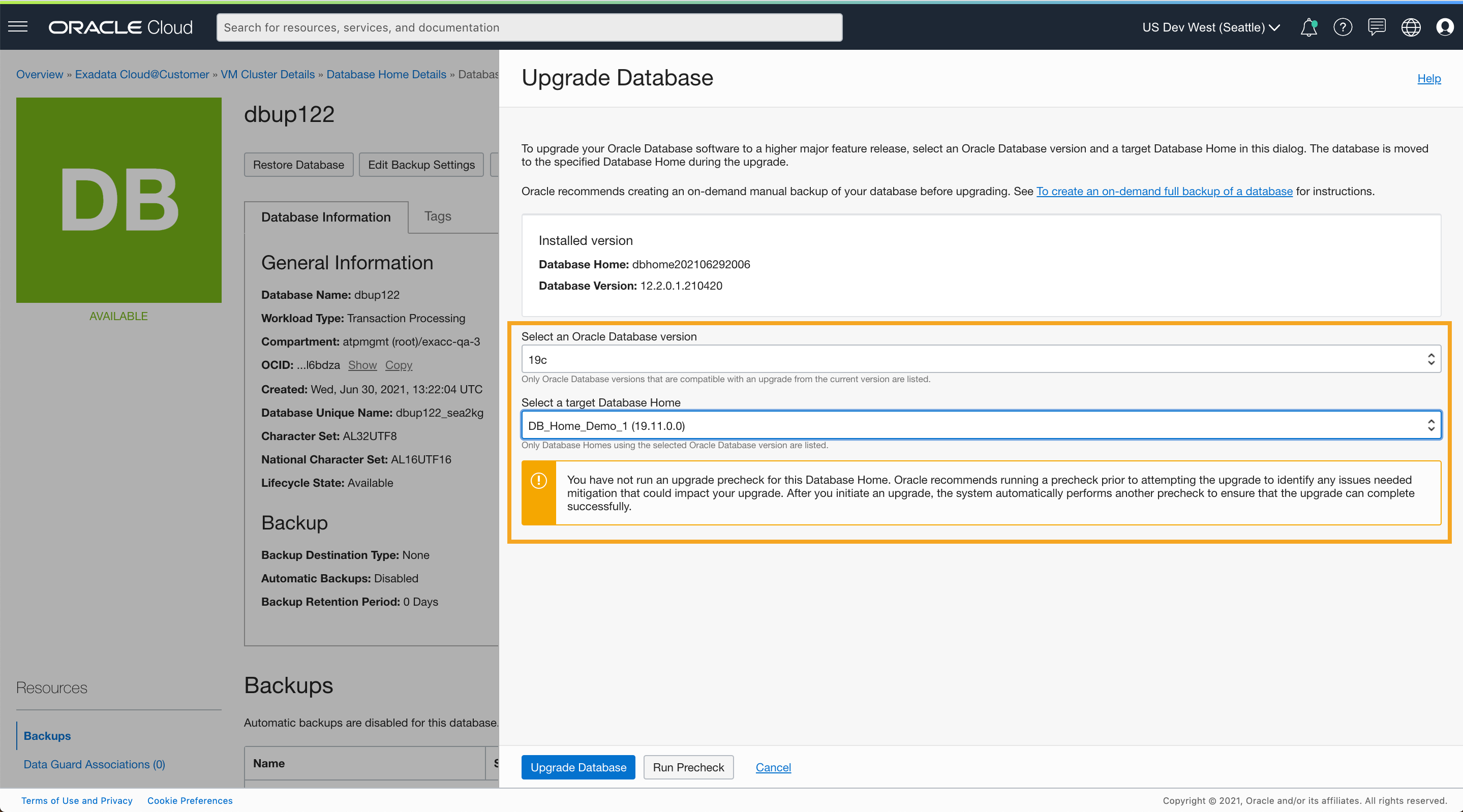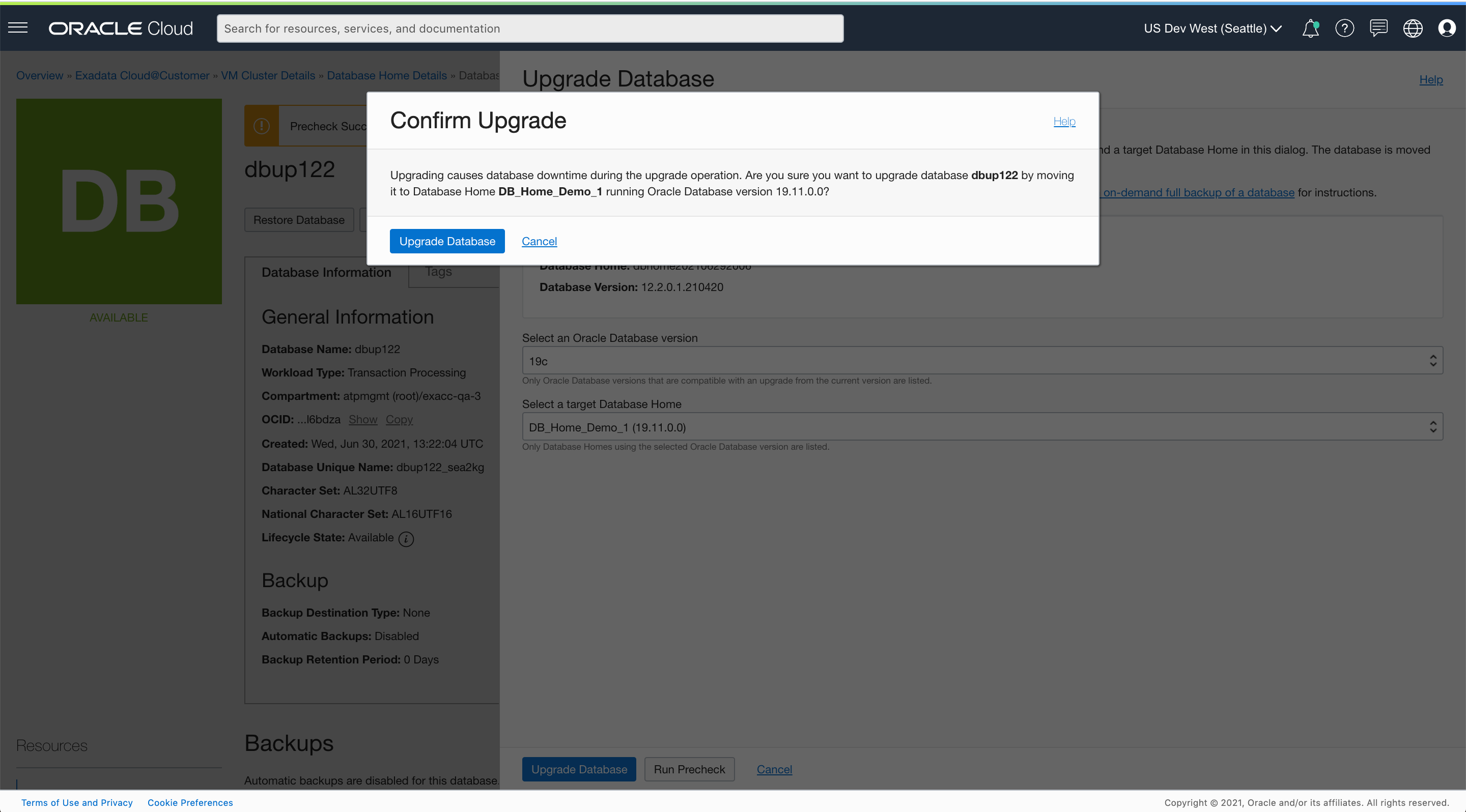 Note: The upgrade flow always runs an implicit precheck to ensure compatibility and sets up a guaranteed restore point before running the Oracle Database Upgrade Assistant (DBUA) to upgrade. These details are visible through the work request for the upgrade flow.