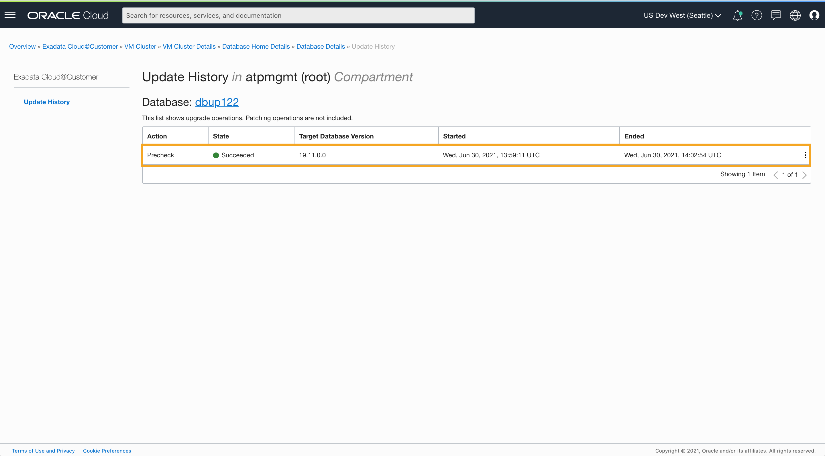 You can view the results of the precheck through the update history of your database. A successful precheck helps ensure the target home is compatible and ready for the database to upgrade and move. In case of a failure, you can take corrective action to resolve the issues found during precheck before proceeding with an upgrade.