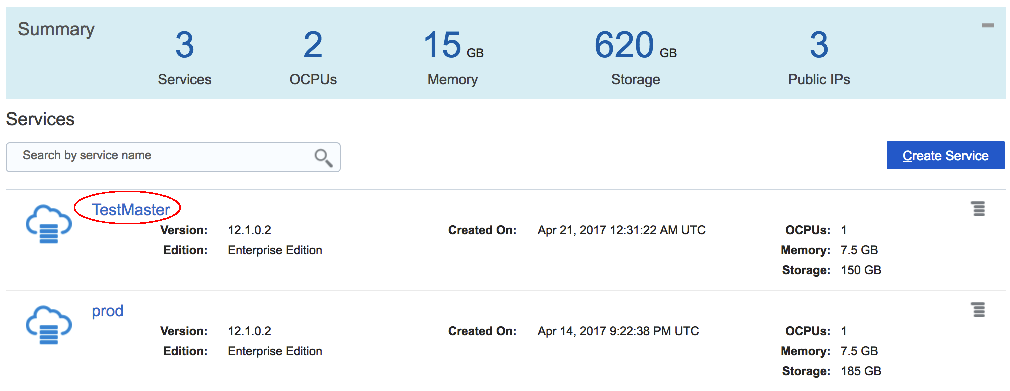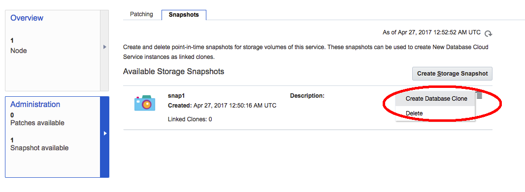 Once you pick the database service, the console shows all of your provisioned database instances along with summary information. In this case, lets say we wish to clone the ‘prod’ database to create a test master that will serve as a source for all of my thin clones.