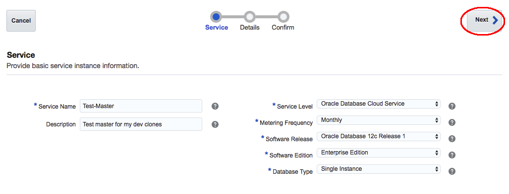 We start with provisioning a new service through the ‘Create Service‘ button. Let’s fill-in the service details. I will call the service ‘TestMaster’, and pick options as shown below