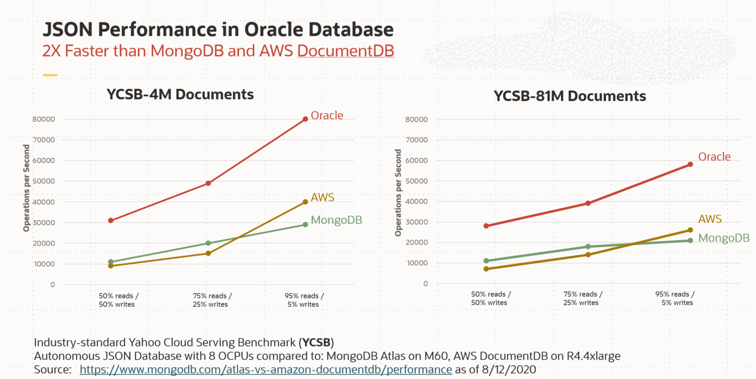 In our internal evaluation, Autonomous JSON Database with 8OCPU and 1 TB storage configuration that is comparable MongoDB Atlas M60 and AWS DocumentDB on R4.4xlarge configuration consistently outperformed for different type of workloads. These workloads are performed on 4 Million and 81 Million documents with each document.