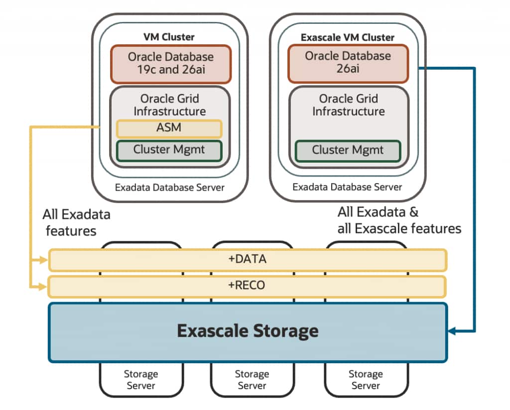 As Oracle Database environments have scaled and migrated to the cloud in large numbers, Oracle recognized an opportunity to re-imagine ASM to deliver a truly cloud-scale storage system to address current and future needs. Exascale introduces advanced capabilities such as pooling vast storage resources with minimal capacity partitions for simpler, more efficient management. It enables seamless addition of new storage—including newer, higher capacity devices—into existing systems. Fast thin clones can now be created and managed directly within the Oracle Database environment, making it easier to support development and QA efforts with minimal additional infrastructure. Exascale also enables sharing storage capacity across VM clusters for greater utilization, and it allows database clones to be mounted across VM clusters. This lets customers take full advantage of Exadata performance while running workloads on different compute resources.