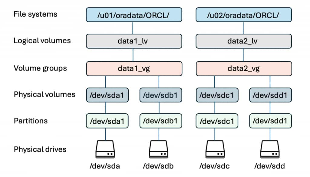 In the early days of the Oracle Database, databases were hosted on either traditional file systems or raw devices. File systems were created on top of physical disks, usually aggregated and/or protected with software RAID and Logical Volume Managers (LVMs). While requiring high amounts of manual administration and being difficult to optimize, this model was relatively straightforward, using the familiar file system hierarchy, access, and permissions model. This was the era when DBAs segregated “data” tablespace datafiles onto different physical volumes from their corresponding “index” datafiles to distribute load, achieve greater aggregate performance, and avoid saturating a subset of disks and degrading performance. File systems of the day faced maximum capacity and file size limitations, such as 16 TiB max for an ext2 file system, and 2 GiB file size max for NTFS. These limits increased file and volume management overhead for administrators. Additionally, differences in operating system implementations and their interactions with file systems created the potential for lost writes in the event of an unplanned outage.