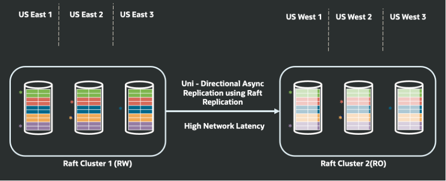 Single-region deployments can introduce a critical risk since they are one outage away from taking an entire application offline. To address this, organizations are increasingly adopting always-on distributed database architectures that span multiple regions. In addition to supporting local Raft-based replication in an active-active-active configuration, an upcoming release of Oracle Globally Distributed AI Database will also support multi-region resilience using Raft-based replication with an active-passive topology and unidirectional asynchronous replication, enabling data to be continuously replicated across regions.